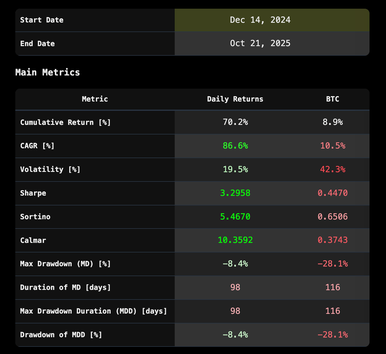 The strategy’s risk-adjusted performance significantly exceeds BTC: